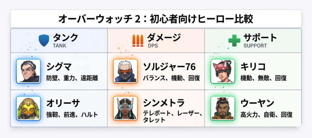 「Overwatch を始めたけど、どのヒーローを使えばいいか分からない」——そういう人に向けて、実際にプレイして感じた視点からロールの選び方とおすすめヒーローを紹介します。よくある「初心者向けヒーローまとめ」とは少し違う、もう少し踏み込んだ理由付きで選んでいます。