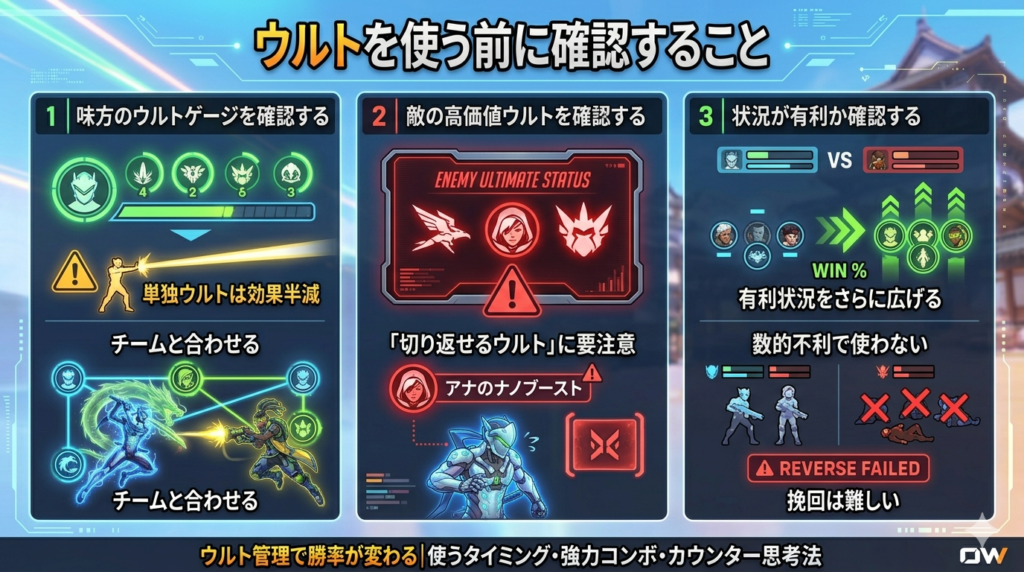 • 敵の切り返しウルトが残っている:ラインハルトのアースシャッターやアナのナノブーストが残っているとウルトを無駄撃ちするリスクが高い