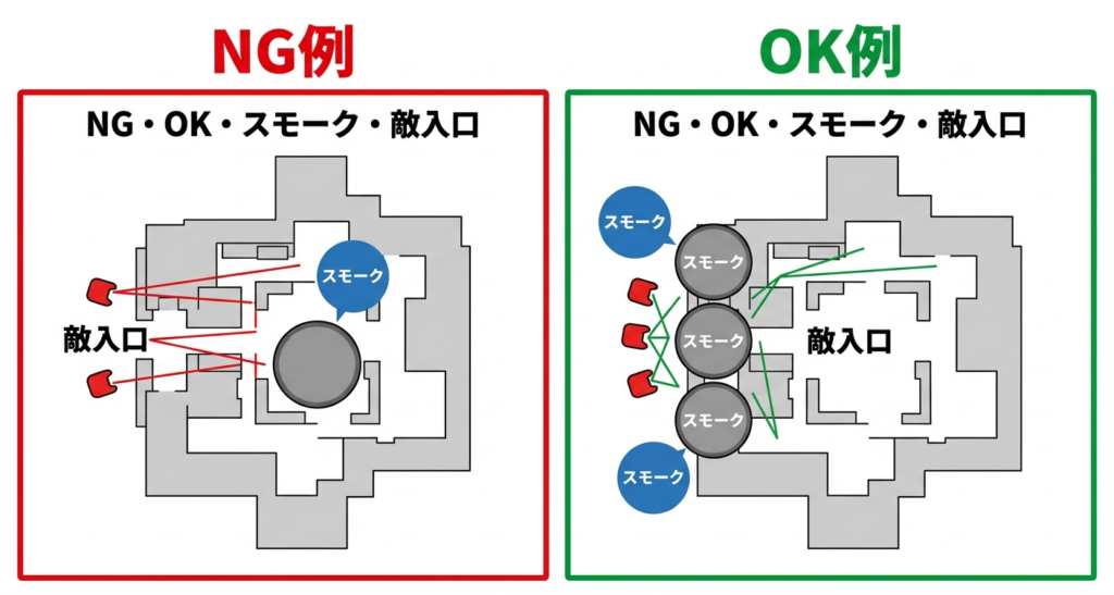 スモークを置く場所には明確な「正解」があります。基本原則は「敵の視線が通る場所を塞ぐ」こと。場所を間違えると味方の視線まで遮ってしまいます。